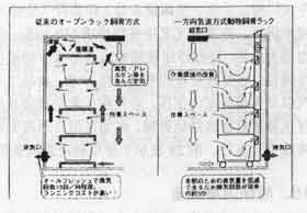 与制药、医学科学实验关系密切的实验动物设施也是与洁净技术有关的。日本实验动物设施研究会指定的环境标准为: (1) 对鼠类的温度为 20 ℃~ 26 ℃,对猴、狗、猫之类为 18 ℃~ 26 ℃,相对湿度为 40~60 %; (2) 换气次数为 10~15 次/时,气流速度为 0.13 ~ 0 , 18m / s : (3) 压差梯度为 50Pa(SPF 动物区域 ) / 150Pa( 隔离系统 ) ; (4) 灰尘等级为 IS07 级 (SF209b10000 级 ) ,落下菌数为《 6 个/ Φ>90.h( 非饲育屏障区 ) 及 <60 个/ 090.h( 非饲育的通常区域 ) ; (5) 氨浓度不 >20PPm ; (6) 噪声不高于 60 。新型的屏障系统是采用乱流方式送风,上送下回,但由于未能在动物饲育容器内形成良好的气流,换气效率不高。新型的饲育架改善了容器内气流,使提高容器内换气效率的同时,可减少一半风量。图 27 画出了新、老二种气流方式的对比。