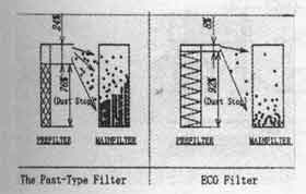 2) 优化预过滤器和主过滤器的组配——对于大量的民用建筑按“人楼管理法”, 3000m2 以上的建筑应没二级过滤器 ( 预过滤 + 主过滤器 ) ,如何提高预过滤器的效率和容尘量,有利于主过滤器 ( 一般为中高效过滤器 ) 延长使用寿命 ( 更换周期 ) ,对系统的稳定和减少风机动力消耗都是有利的。日本把这种搭配称为 Eco 过滤器。它与一般的区别可从图 32 和图 33 中看出。 3) 除了从以上经济性为主的进行研究开发外,还进一步采取以环境影响为中心的 LCA( 寿命周期评价 ) 方法来指导过滤器的研发工作,以尽量减少过滤器对环境的负荷 (C02) 排放量等 ) 。