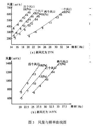 从图2 和图3 可以看出: (1) 从一个风口到四个风口,风量与频率具有线性关系; (2) 在送风量达到700m3/ h 以上后,送风量与室内外压差也基本具有线性关系; (3) 送风量达到200~300m3/ h ,新风比在27 %以上,可使室内保持5Pa 以上正压。因此,风量与正压均满足本课题实验以10 万级为起点的要求; (4) 当新风比降到5 %时,保持5Pa 以上压差需要更大的送风量;或者说,在相同送风量下,保持相同压差需要的新风量减少了。
