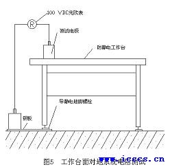 国内相关的标准有GJB3007-1997《防静电工作区技术要求》、SJ/T10694-1996《电子产品制造防静电系统测试方法》等,但均不太完整。参照了GJB3007-1997《防静电工作区技术要求》、SJ/T10694-1996《电子产品制造防静电系统测试方法》、SJ/T11236-2001《防静电贴面板通用规范》、ASTM D4470-1997《静电起电的测试方法》、ASTM F150 -98《导电及静电耗散型弹性地板电阻的测试方法》、GB18584-2001《室内装饰装修材料木家具中有害物质限量》、GB/T 17657-1999《人造板及饰面人造板理化性能试验方法》、QJ2177-1991《防静电安全工作台技术要求》等相关内容,确定防静电工作台的技术指标。相关的指标见表1。电阻的测试设备建议采用ASTM F150 -98《导电及静电耗散型弹性地板电阻的测试方法》中5.2的B型规定的电极,采用100V的测试电压进行检测。要尽可能在温度23±2℃,湿度为50±5%的环境下放置至少24小时,并在这个环境下进行测试。表面电极间电阻测试时两电极间的距离为300±1mm。测试电压为100V直流电压,施加电压10秒钟或数字稳定后读数。系统电阻测试的方法见图5。