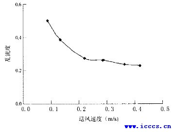 图8 横断面脉动监控图像 从图像可以看出: ①在洁净区的横断面上,速度的分布是不均匀的,速度范围在0.15m/s~0.38m/s之间波动; 因此,洁净区内的各点的速度脉动较小,质点间的掺混不很明显,较难出现明显的涡流区。 用乱流度来衡量速度场的均匀性是基于速度场均匀程度和微粒集中度的相似性,其公式表达形式是: