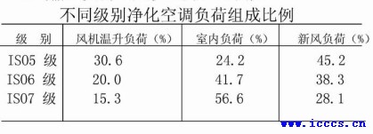 ·洁净室能耗统计的部分数据[1] : ·能耗为一般办公建筑的10~30倍 ·8寸芯片厂1.86KW/㎡,12寸芯片厂2.88KW/㎡ ·5代TFT厂0.98KW/㎡,6代TFT厂1.66KW/㎡ ·其中空调通风及冷热源能耗约占40~70% 1.3其他专业对洁净室空调能耗的影响·周边环境 ——空调节能不是空调专业一家的事情 1.4洁净室空调的节能潜力很大·总能耗高意味着即时节能比例不大但实际节能效果很可观 ·节能管理或改造所需投资与生产线投资与运行费用相比很小 ·许多企业实施节能改造与加强节能管理后收益明显[2] ·政府与主管部门支持力度很大 2.洁净室的能耗特点2.1空调负荷结构与普通空调有明显差别·空调主要设备分为: 新风负荷、室内负荷(照明、设备、人员)、维护结构传热负荷。洁净室的维护结构传热负荷占比例很小,但新风负荷、空气输送负荷(风机温升)比例大 下表: 不同级别净化空调负荷组成比例