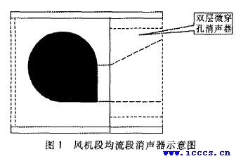 微穿孔消声器低频段的消声量计算: LTL=10lg(1+(a+0.25)/(a2+b2(f/fo-fo/f)2)) (分贝) (1) 式中:a=rs b=sc/(2πfov) r-相对声阻 微穿孔低频吸收器其共振频率是随着板厚和腔深增大而减小,随着穿孔率增大而增大,因此低频吸收器可做成双层微穿孔结构。 在洁净空调中考虑到空气洁净其功能段位于正压段,因此对风机段的消声处理带来便利,利用风机均流器的位置做成均流消声器,见图1。 图1 风机段均流段消声器示意图